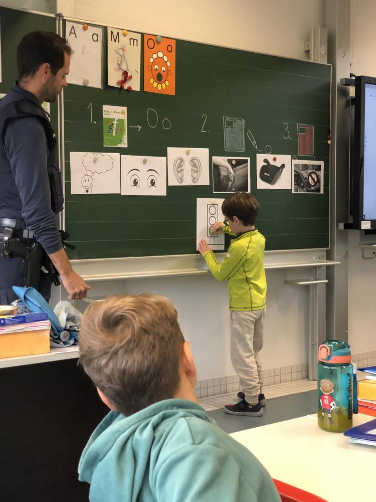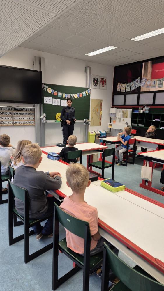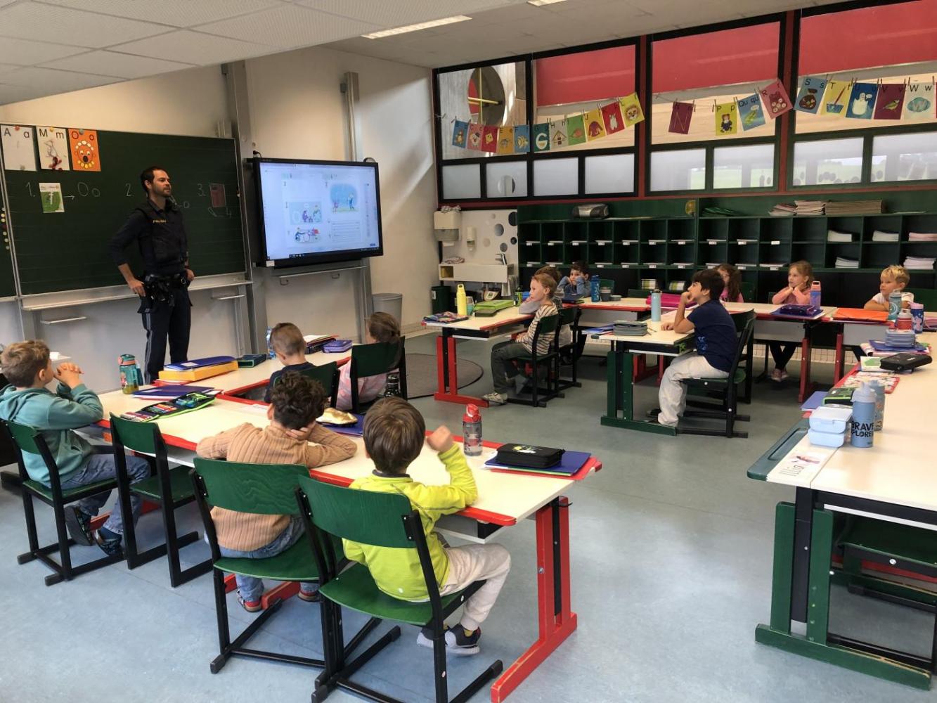 Die Kinder der ersten Klassen bekamen besonderen Besuch: Polizisten kamen vorbei, um mit ihnen über ihren spannenden Beruf zu sprechen. Mit großem Interesse lauschten die Kinder, als die Polizisten von ihrem Alltag erzählten und ihre Ausrüstung vorstellten. Natürlich durften Handschellen, Funkgerät und Schutzweste dabei nicht fehlen!