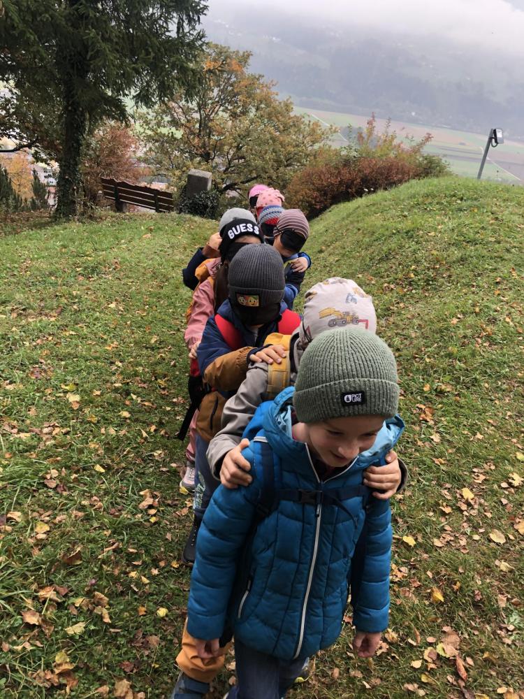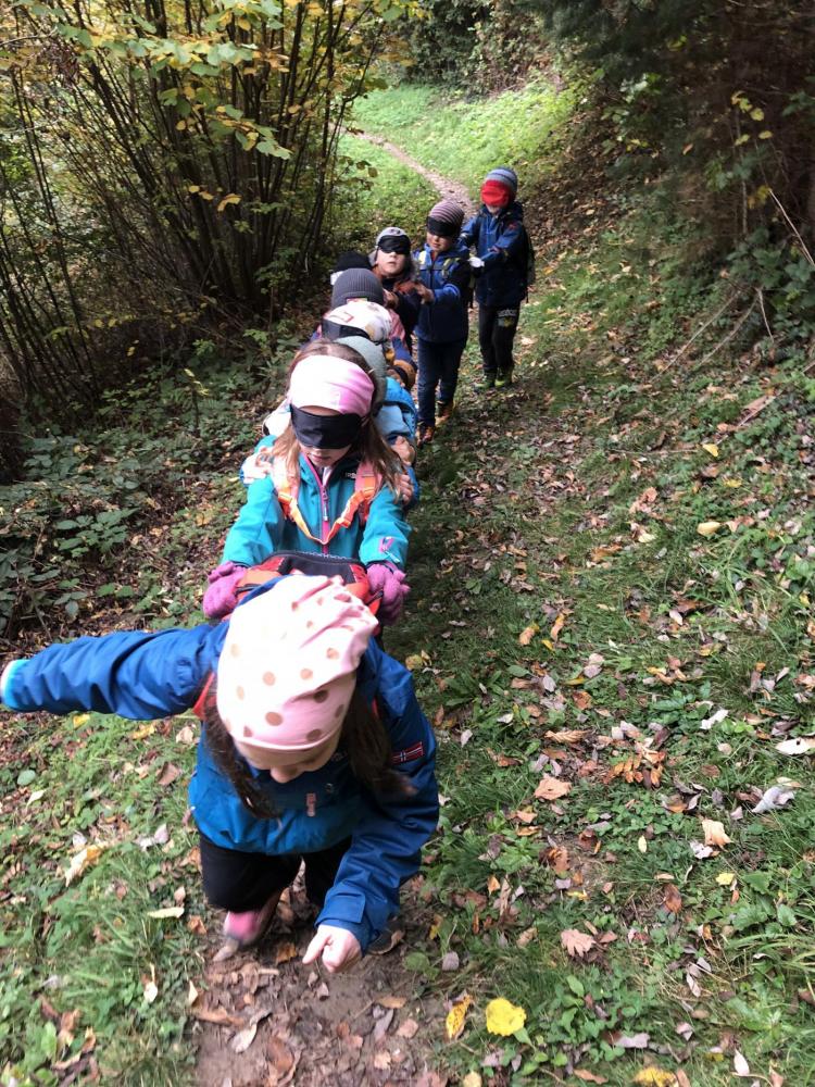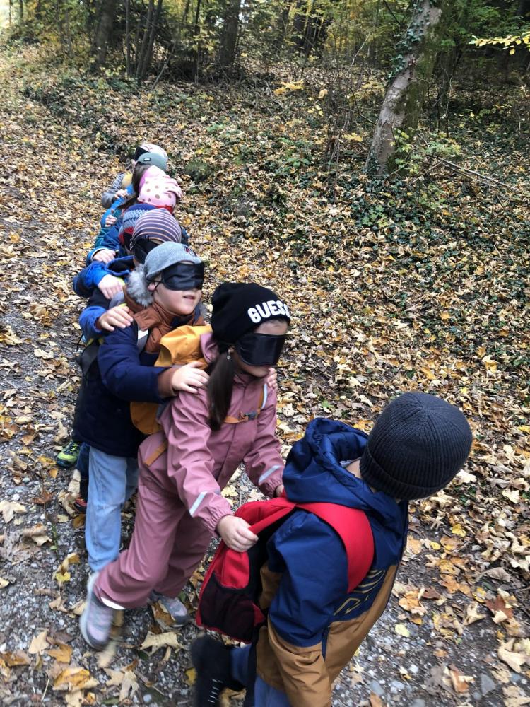 Anschließend durften die Kinder den Wald einmal ganz anders erleben: Mit verbundenen Augen tasteten sie sich vorsichtig heran, lauschten dem Rascheln der Blätter, spürten den Boden unter ihren Füßen und rochen den Duft von Erde und Moos. So wurde der Wald zu einem echten Sinneserlebnis!